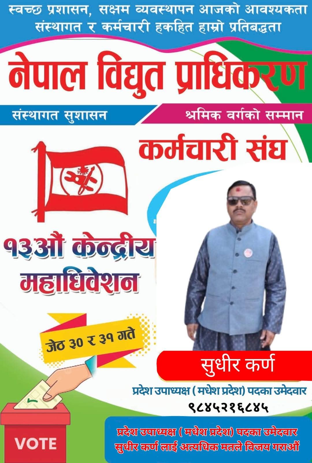 नेपाल विद्युत् प्राधिकरण कर्मचारी संघ मधेस प्रदेश उपाध्यक्ष पदका लागि वीरगंज महानगरपालिकाको छपकैया निवासी सुधीर कर्णले उम्मेदवारी दिएका छन् ।