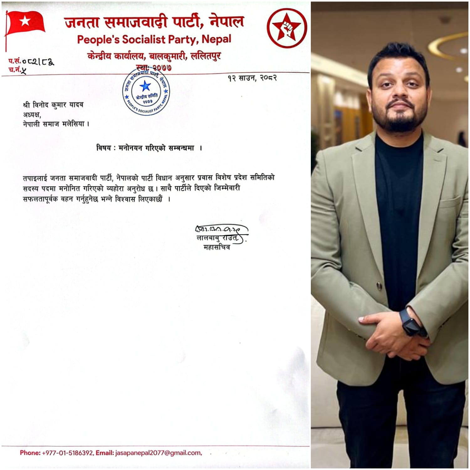 कुआलालम्पुर, मलेसिया | नेपाली समाज मलेसियाका अध्यक्ष विनोद कुमार यादवलाई जनता समाजवादी पार्टी, नेपालको विधानअनुसार प्रवास विशेष प्रदेश समितिमा सदस्य पदमा मनोनयन गरिएको छ।